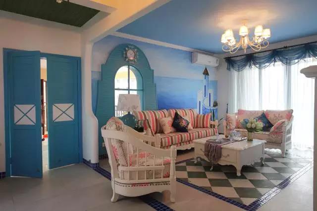 以馬賽克裝飾會客區(qū)的地面,除了沙發(fā)背景墻元素有點(diǎn)多,白色紗簾藍(lán)色簾頭倒是很出彩。
