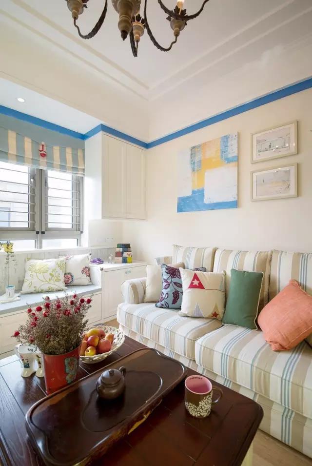 客廳吊頂做了簡單的石膏線,藍(lán)色的裝飾帶使空間顯得十分靈動(dòng)。
