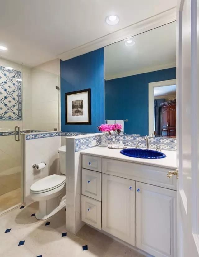 狹長型的衛(wèi)生間,或半墻或半墻加玻璃的方式進(jìn)行隔斷,藍(lán)色的局部背景墻讓空間不再那么“禁欲”。