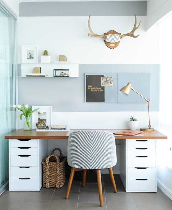 現(xiàn)代簡約風(fēng)工作臺:在窗臺邊辟一處空間,或者在臥室的一角安置一套桌椅也能打造舒適的工作空間,置物架的應(yīng)用可以增加很多收納空間,也令整個空間更具文藝氣息,如果空間夠大,可以打造適合兩人的工作臺。