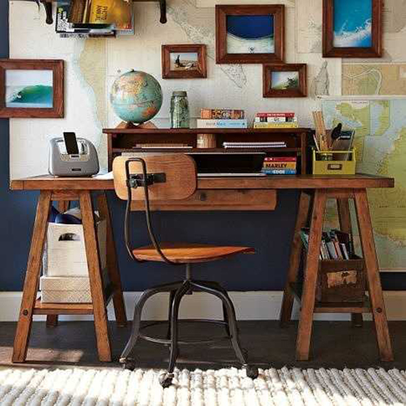 工業(yè)風(fēng)工作臺:厚重或做舊處理的實木桌椅搭配適量的鐵藝元素,整個空間更顯硬朗,有種返璞歸真的敦厚和寧靜。