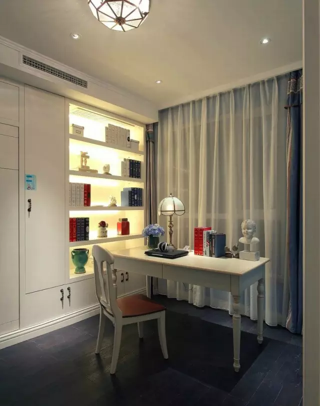 飄窗簾與純白色的家具搭配,顯得書房有某種神秘的安靜,進(jìn)到書房整個人會變得莫名其妙的心靜下來吧