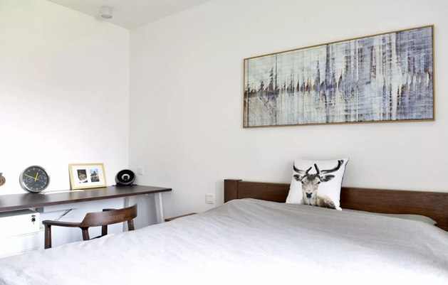 主臥空間,休息家小型工作區(qū),簡單,清爽,干凈,專門買了大大的床,去掉多余裝飾只留了簡單線條裝飾畫,