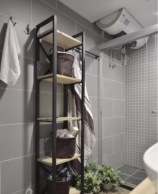 灰色調(diào)為主的衛(wèi)生間,避免純灰的單調(diào),選用了三種不同花樣不同尺寸的貼磚,顯得很有層次感。還有一個(gè)兼具裝飾與實(shí)用性的置物架。