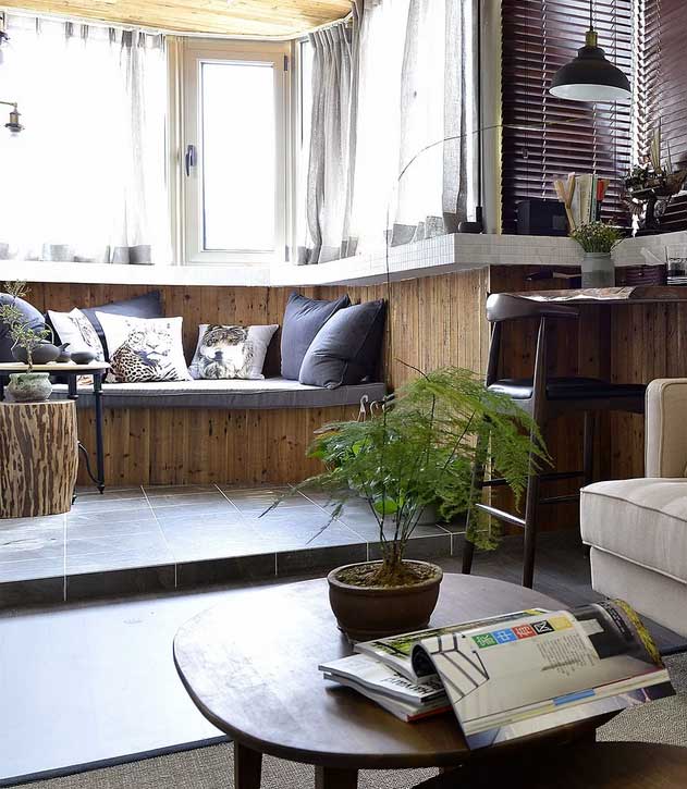 客廳溫馨且舒適,光線簡直成為了家中最亮堂的小天地,一大片的深色木質(zhì)書架,暴露了屋主喜歡看書的愛好,木質(zhì)椅,落地書燈,還有一個(gè)原生態(tài)木質(zhì)桌,不占地,還顏值高!
