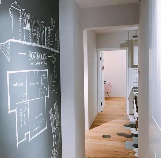 如果家里有小孩的情況,不妨把走廊的大白墻改成黑板墻,給小孩一個涂涂畫畫的小空間。有了黑板墻,再也不用擔(dān)心大白墻被涂花了。相比大白墻,黑板墻的裝飾效果充滿童趣。