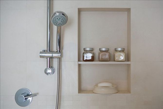 4、衛(wèi)生間一般沒有多余的空間做壁蓋,可以考慮坐下面這種的壁龕,平時放放洗浴用品什么非常方便!