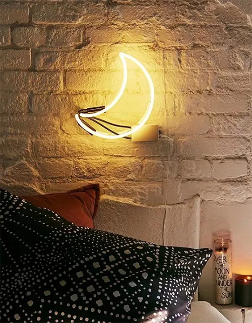 如果你對霓虹燈的印象還停留在酒吧和商業(yè)街,那端端可真是要?dú)獾椒籽哿?。造型多變的霓虹燈不僅能做臥室空間的氛圍照明,還能替代裝飾畫做床頭區(qū)的主要裝飾。