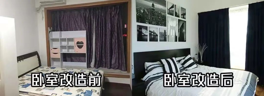 臥室改造前空調(diào)管很明顯,看起來不美觀,地板深木色,加之周圍過道極窄,睡眠環(huán)境略顯沉重壓抑。過道窄到床的兩邊無法放下床頭柜,臥室還存在窗簾透光的問題。