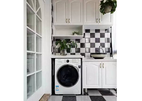 可以選擇把陽臺改成洗衣區(qū),上面有吊頂。是最省錢的,上面還可以儲物,放東西。還有洗手盤,平時可以洗點(diǎn)衣服這樣。