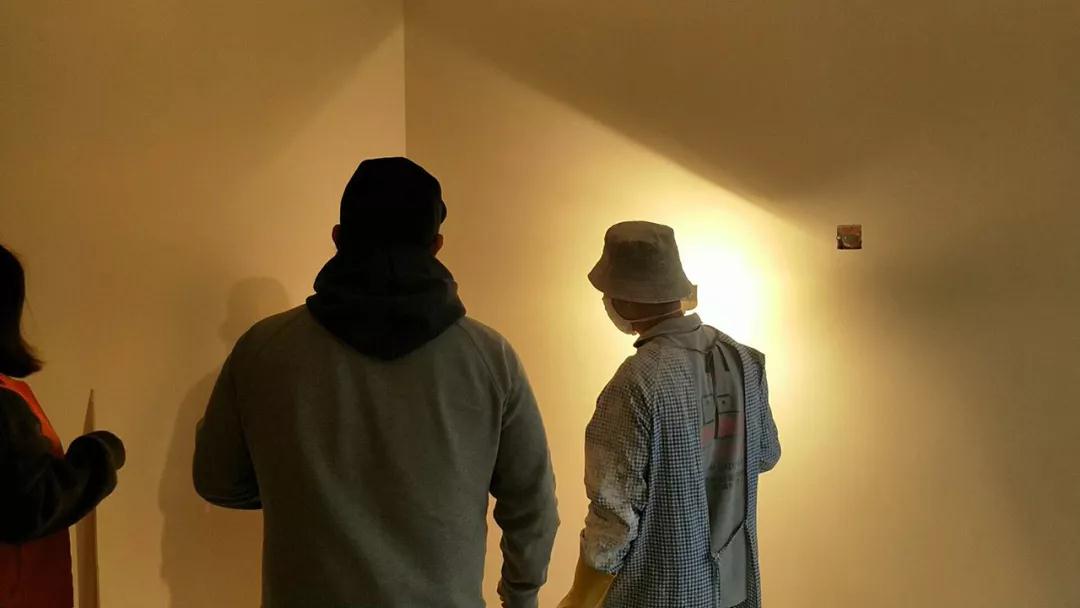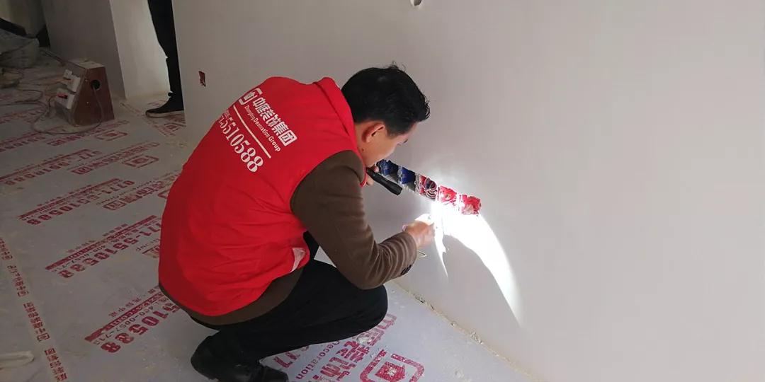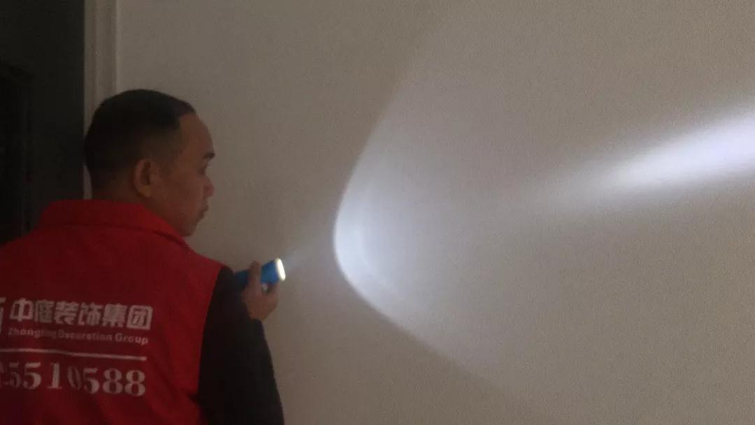 集團(tuán)工程質(zhì)量管理中心總監(jiān)吳總用強光手電筒檢查刮膩子平整度