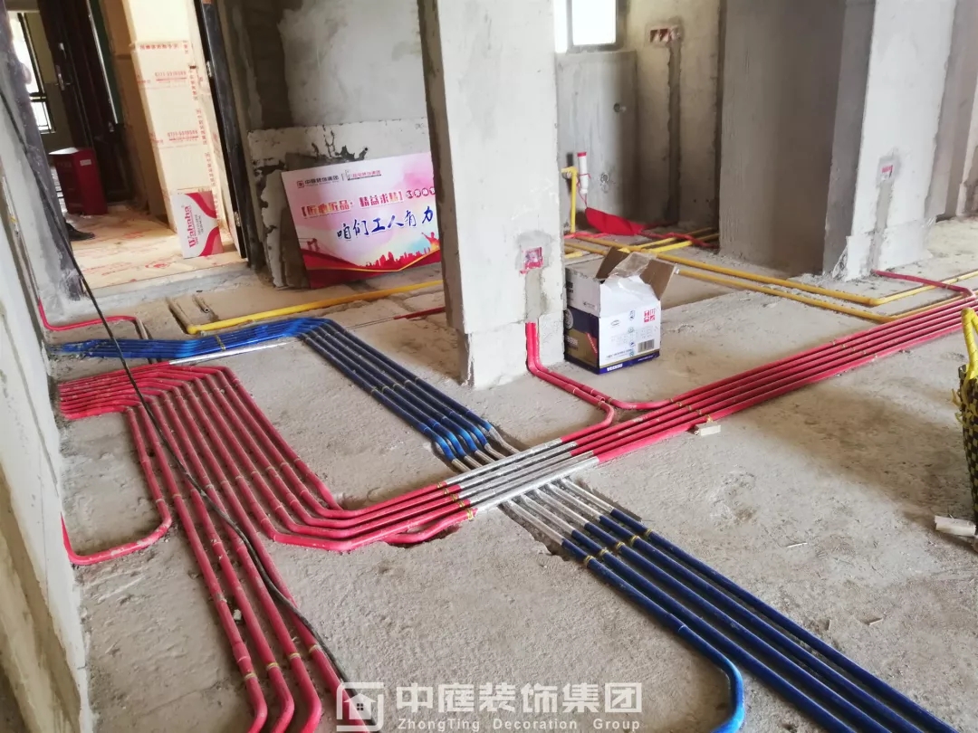 施工現(xiàn)場線管鋪設橫平豎直,按照集團施工規(guī)定使用鐵皮卡扣固定,管和管之間留有足夠縫隙,以便鋪設地磚時水泥砂漿進入管下,避免地磚后期出現(xiàn)空鼓;強弱電交匯處,用錫紙包裹保護,可以有效防止對弱電產(chǎn)生信號干擾。