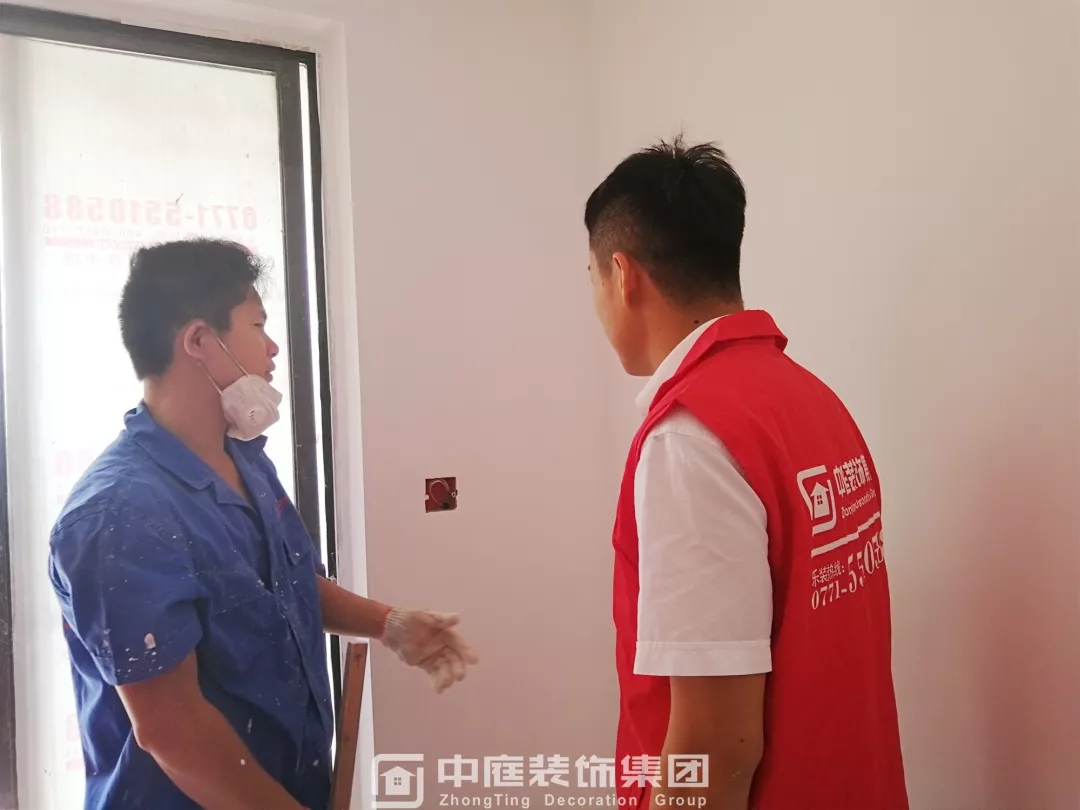 利用強光手電筒檢查墻面平整度及陰角是否達到集團施工標準