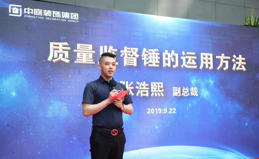 ▲集團(tuán)副總裁張浩熙先生向業(yè)主代表授予質(zhì)量監(jiān)督錘,并講解質(zhì)量監(jiān)督錘的運(yùn)用方法。