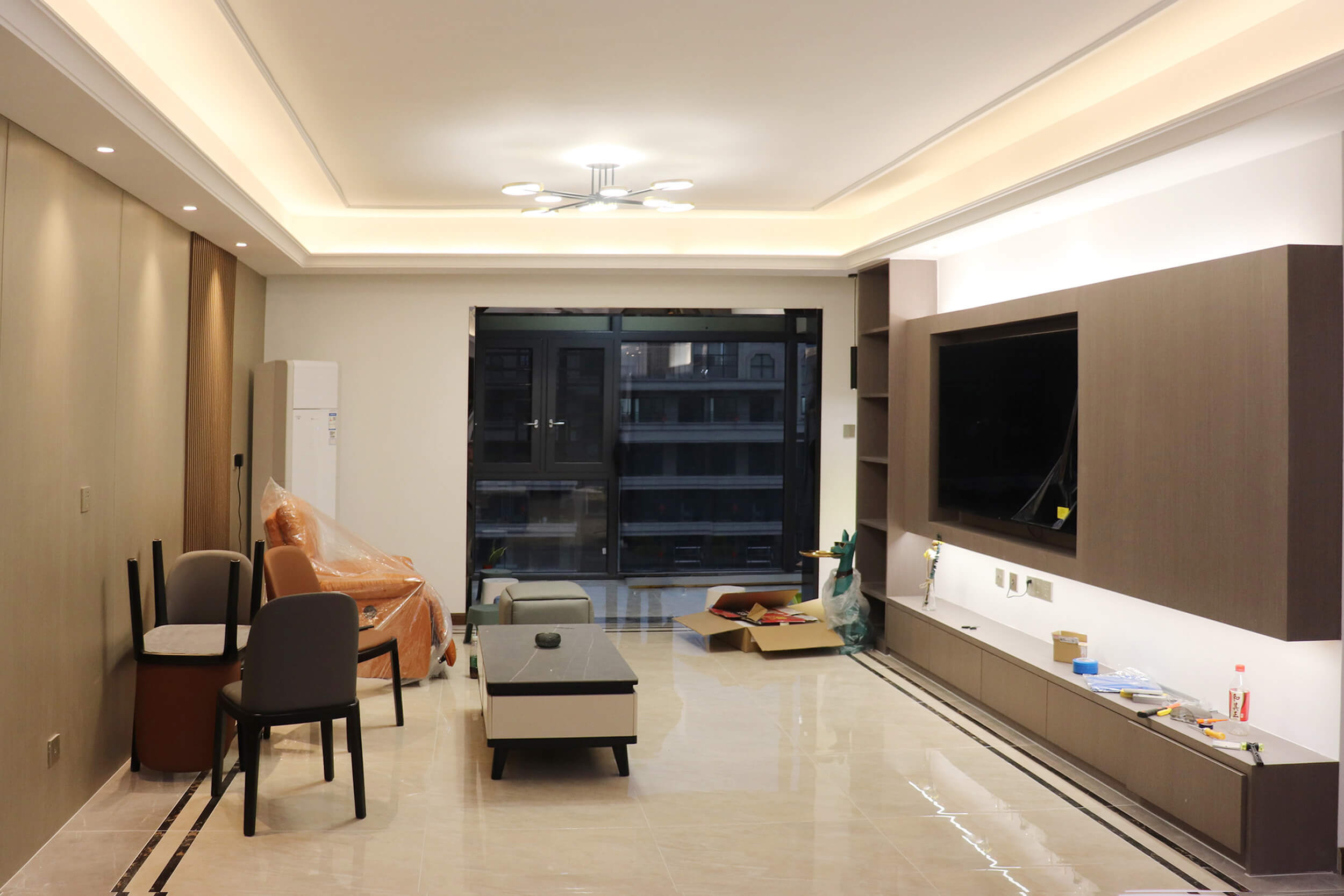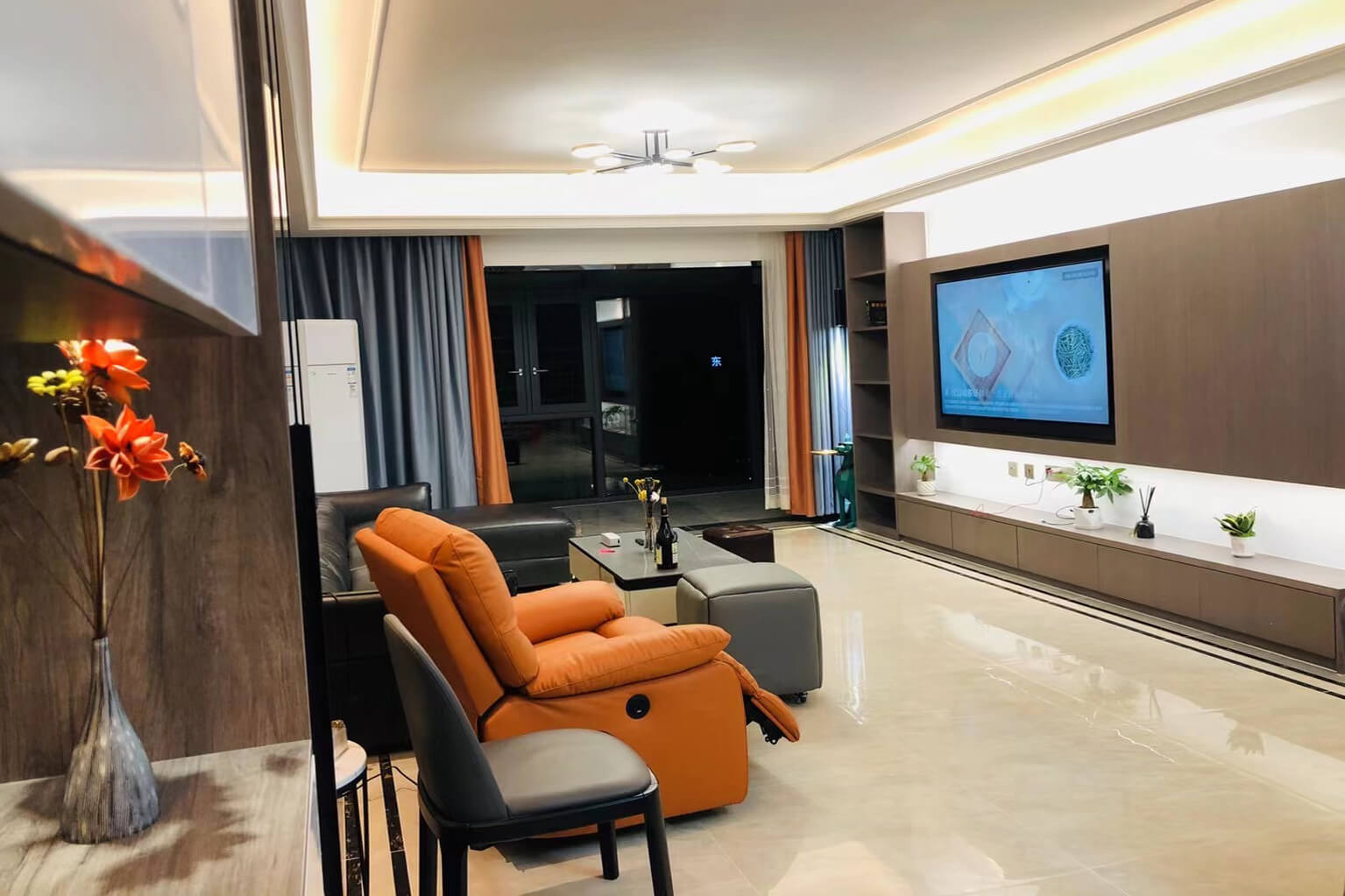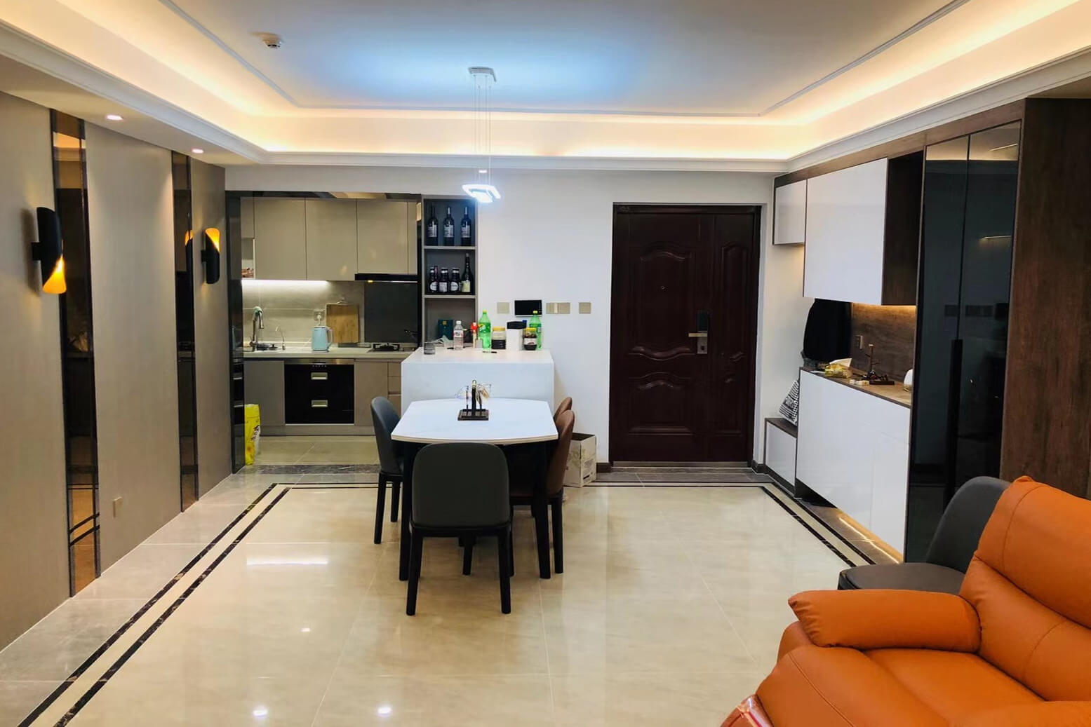 瀏覽量:341客餐廳選擇素色的木飾面顯現(xiàn)低調(diào)有內(nèi)涵,整個客廳及餐廳的吊頂直接一體貫穿,搭配著電視背景墻長方體設(shè)計突顯空間的寬闊大氣,愛馬仕橙色的窗簾及單人沙發(fā)的呼應(yīng),增添了空間的活躍性;暖黃色燈光下白色的大理石吧臺及白色的高光柜門使得空間不再昏沉,局部黑色的鈦金夾著茶色的鏡面在大面積的素色木飾面的包裹下將現(xiàn)代的低調(diào)且奢華體現(xiàn)完美的體現(xiàn)了。