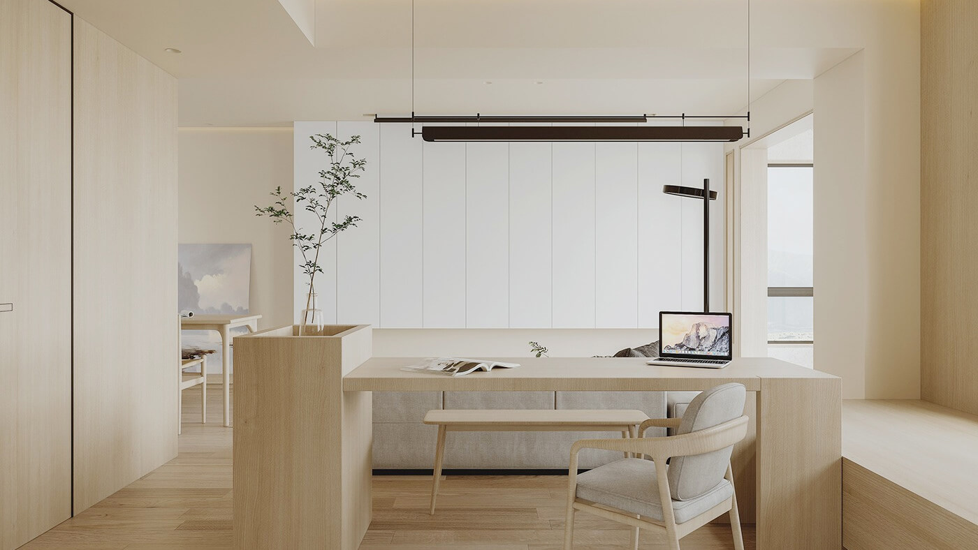 該案例采用木質(zhì)元素,整體呈現(xiàn)簡約效果,空間上將空間極大化利用的設計。日式家居中多采用沉靜溫和的自然色彩,家具的造型線條簡潔,大氣又自然。