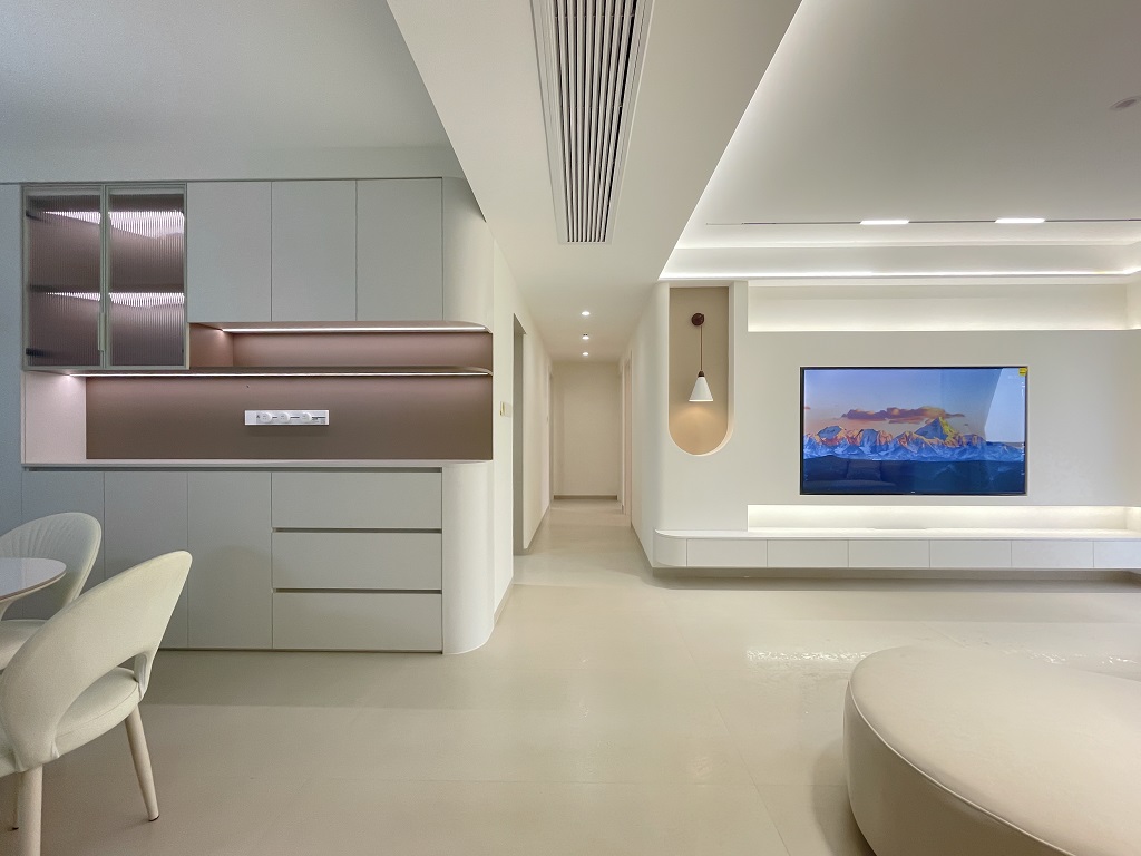 空間整體奶白色調(diào)裝飾,耶為空間帶來了充沛的光線,設計師整體結(jié)構(gòu)上不設明顯的界定,在裝修次材料、色彩搭配上逐步描述空間的構(gòu)成關(guān)系。