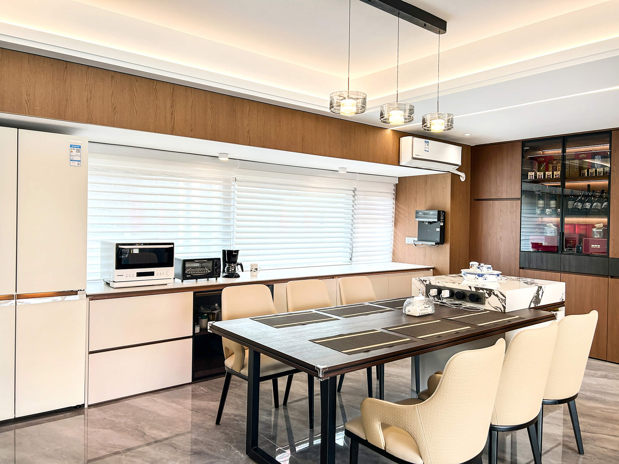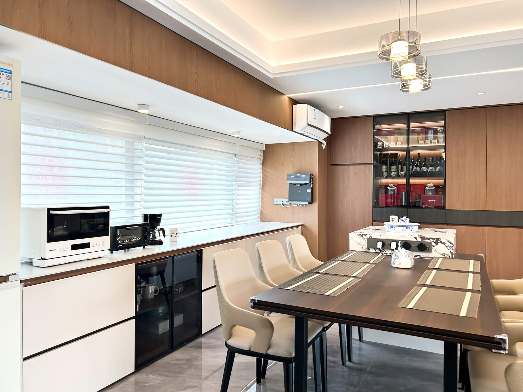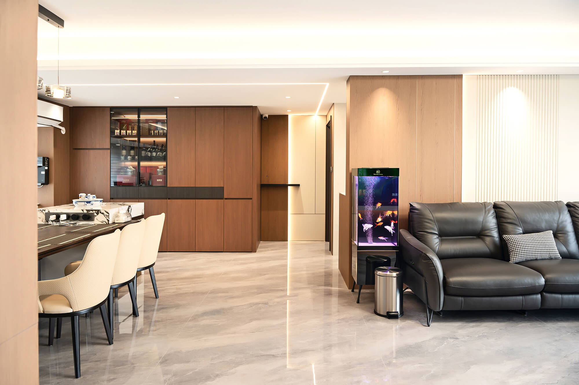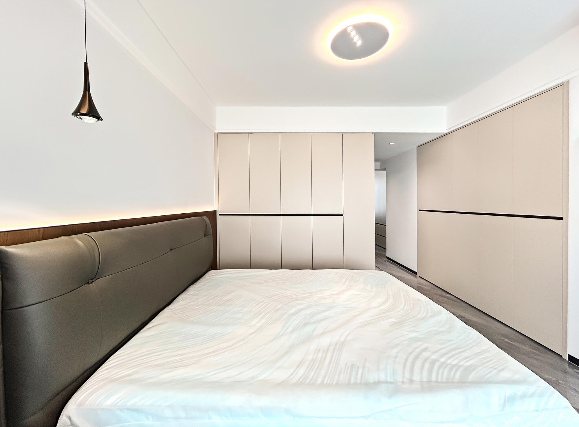 以 “少即是精” 為核心,用純粹線條與留白奠定基調(diào),搭配金屬巖板等質(zhì)感材質(zhì)作為點(diǎn)綴,拒絕冗余裝飾。色彩以低飽和度中性色為主,通過材質(zhì)碰撞凸顯高級(jí)感,營造克制而精致、兼具舒適與格調(diào)的空間氛圍。