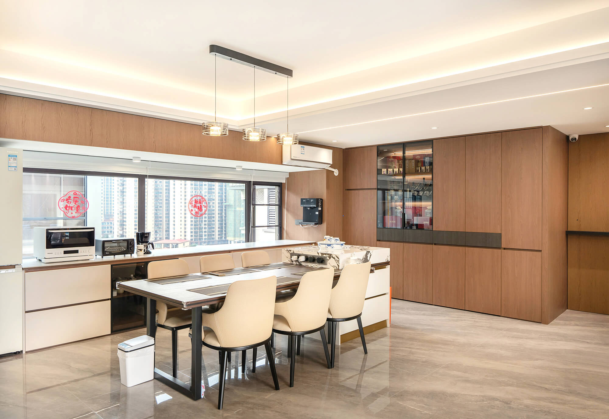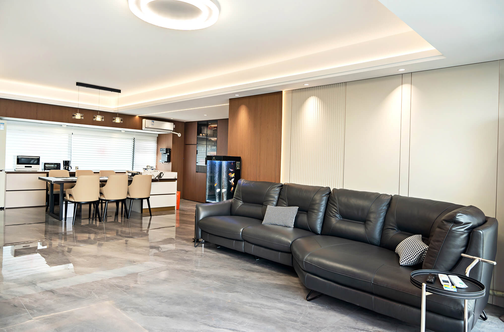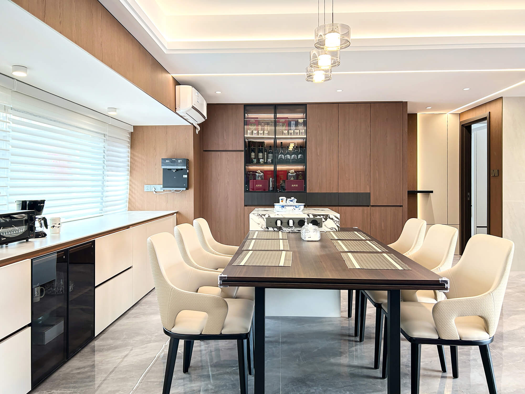 以 “少即是精” 為核心,用純粹線條與留白奠定基調(diào),搭配金屬巖板等質(zhì)感材質(zhì)作為點(diǎn)綴,拒絕冗余裝飾。色彩以低飽和度中性色為主,通過材質(zhì)碰撞凸顯高級(jí)感,營造克制而精致、兼具舒適與格調(diào)的空間氛圍。