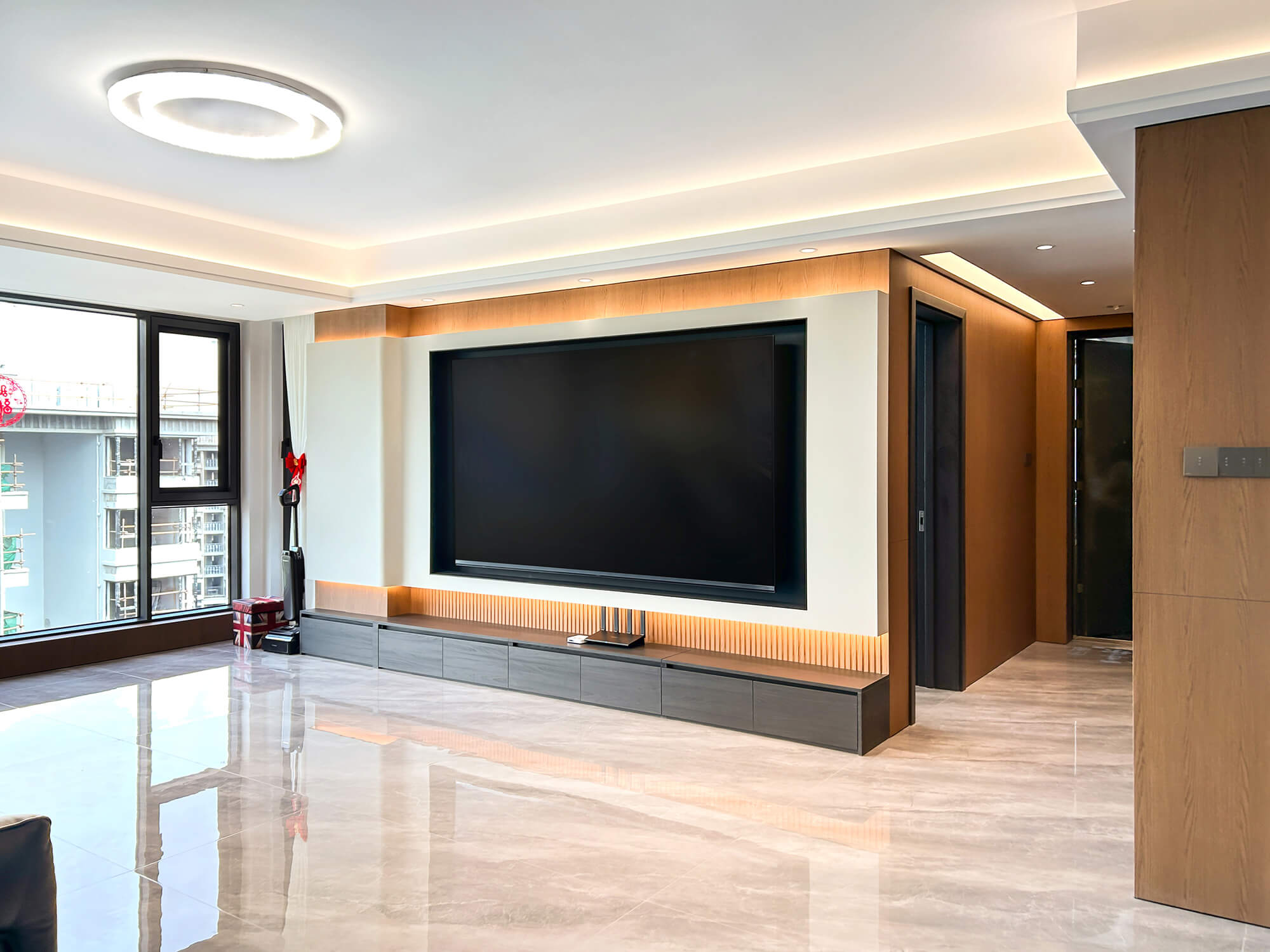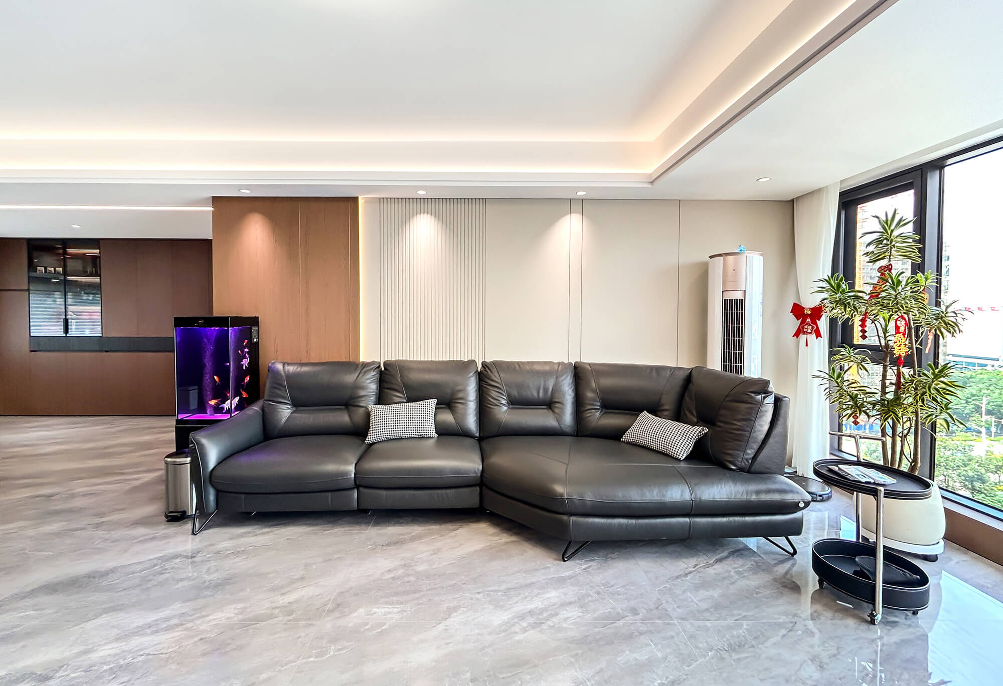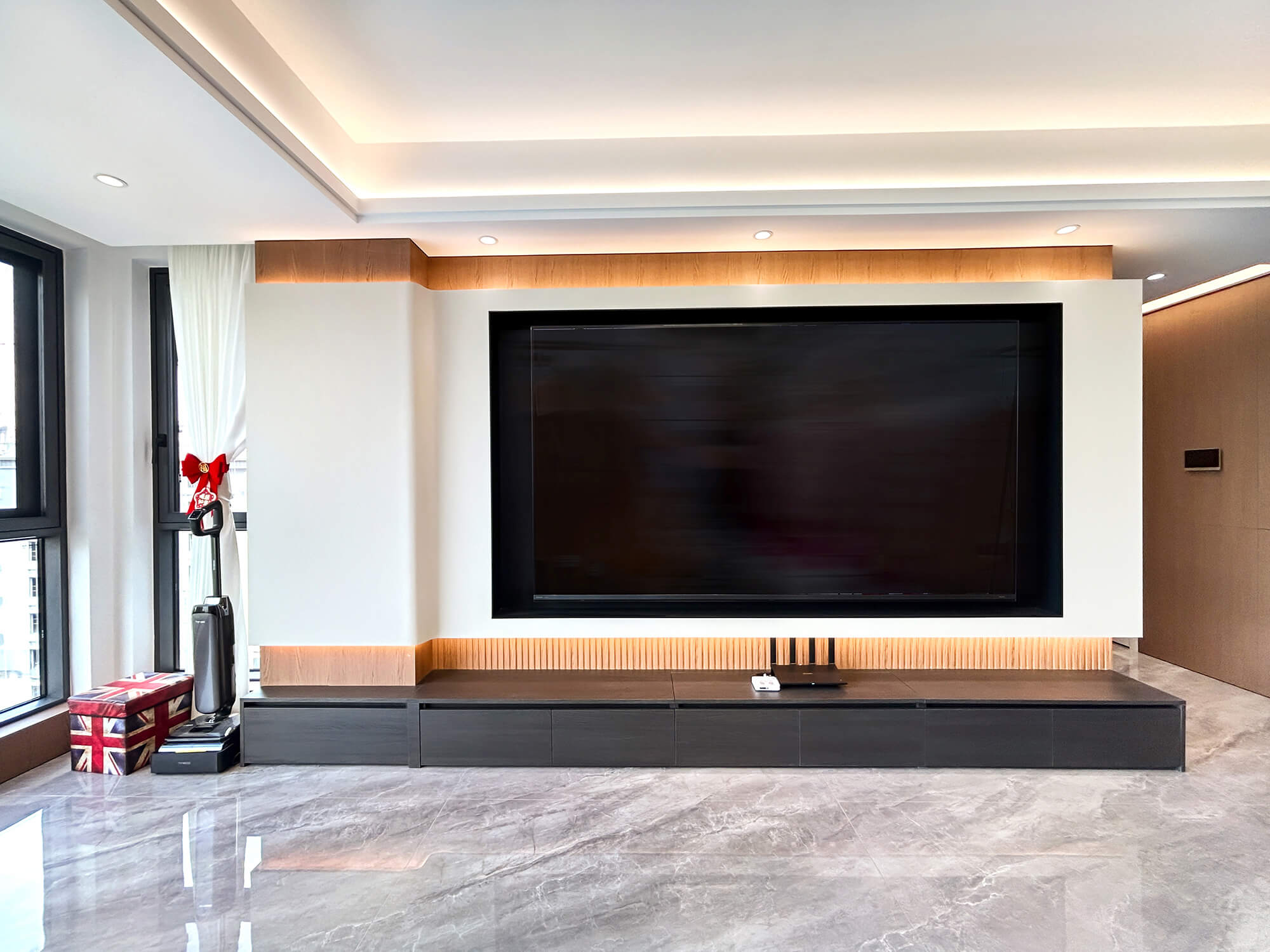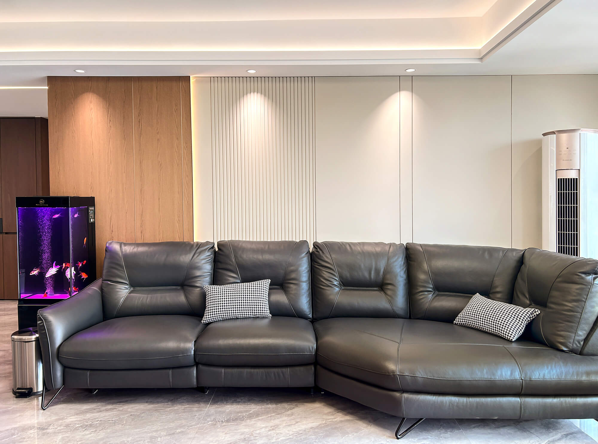 以 “少即是精” 為核心,用純粹線條與留白奠定基調(diào),搭配金屬巖板等質(zhì)感材質(zhì)作為點(diǎn)綴,拒絕冗余裝飾。色彩以低飽和度中性色為主,通過材質(zhì)碰撞凸顯高級(jí)感,營造克制而精致、兼具舒適與格調(diào)的空間氛圍。