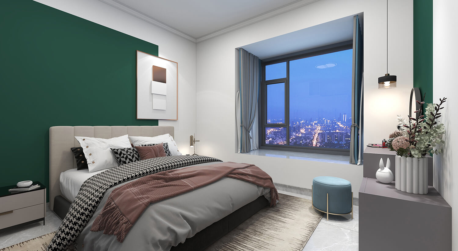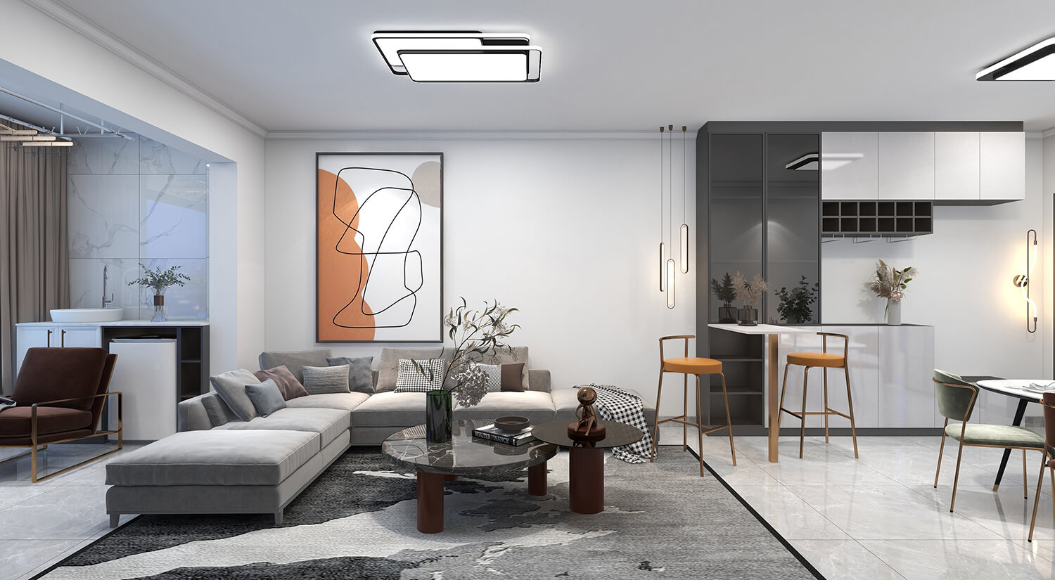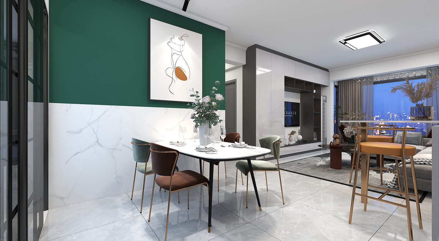瀏覽量:328本案例戶型為:4房1廳2衛(wèi),總面積130㎡。墻壁、地板和天花板的顏色選擇明亮的白色,并搭配少量的深綠色作為點(diǎn)綴。在各種金屬質(zhì)感家具元素的襯托下,整體現(xiàn)代感十足。