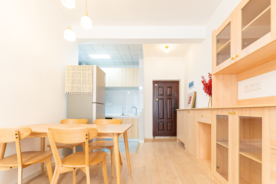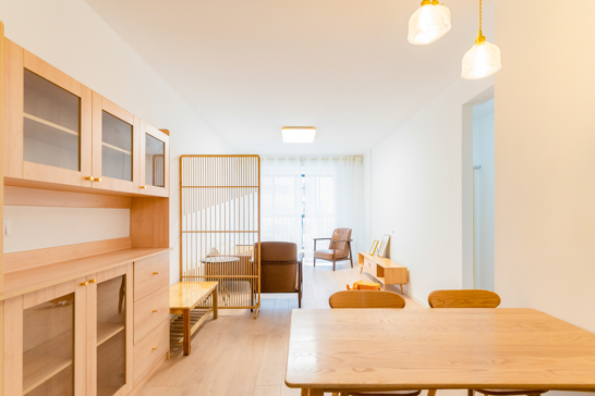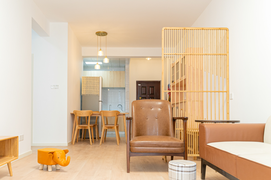 整個(gè)空間基于原木風(fēng)格上做搭配,陽臺打通,解決不互通的采光問題,天氣陰晴,都可以為空間做天然點(diǎn)綴;開放式廚房和餐廳可以共享操作,互不干擾,又可以加強(qiáng)家人之間的互動(dòng)性提高家庭的幸福感。