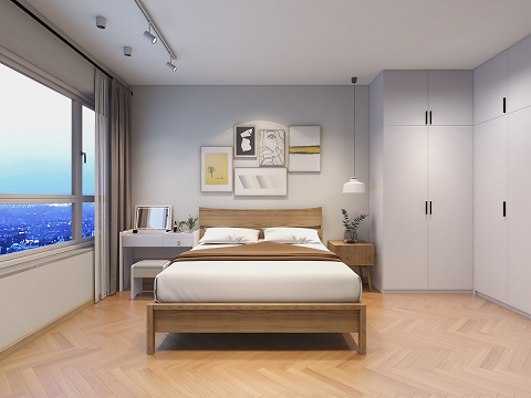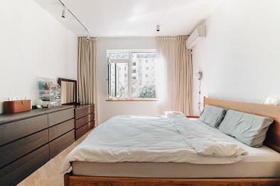 主臥整體用色與風(fēng)格延續(xù)整體原木色系,木地板配木色家具,色調(diào)素雅,加上簡(jiǎn)潔而現(xiàn)代的軟裝陳設(shè),白色的棉麻窗簾讓室內(nèi)的氣氛柔和而溫馨